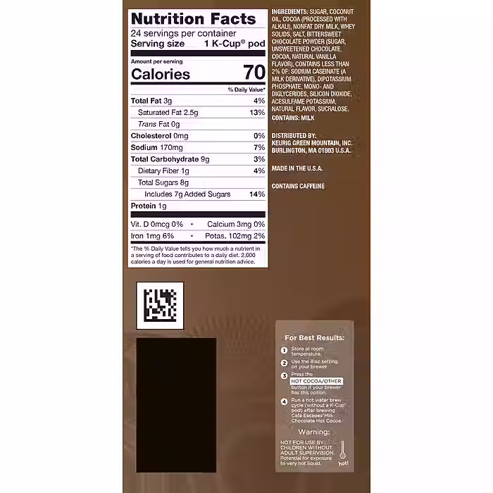 Provide your staff an alternative to coffee with this Keurig K-Cup Cafe Escapes milk chocolate hot cocoa 24-pack. Individual pods eliminate mess in the break room or coffee area, letting employees and visitors make one rich, creamy cup at a time. Containing just 10 milligrams of caffeine per cup, this Keurig K-Cup Cafe Escapes milk chocolate hot cocoa delivers a smooth mid-morning change from highly caffeinated beverages.